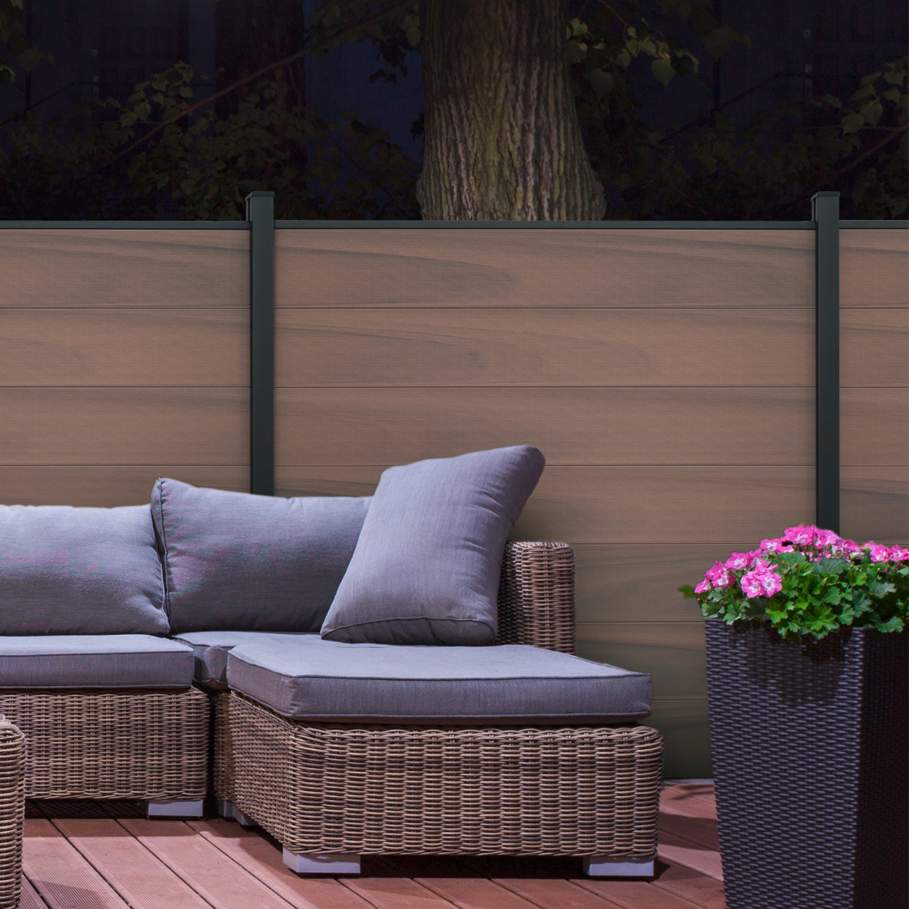 Die BPC-Sichtschutzelemente überzeugen durch besonders breite XL-Füllungen und ein modernes Steckzaunsystem. Ein komplettes Sichtschutzelement (Bausatz) besteht aus sieben waagerecht verlaufenden Füllungen mit einer Höhe von jeweils 25,3 cm, einer Aluminium-Abdeckleiste in matter Aluminiumoptik sowie zwei Distanzstücken, die den Abstand zwischen Zaunelement und Boden definieren. Das Schrägelement ist beidseitig verwendbar und hat eine Höhe von 180 cm auf der hohen Seite und 90 cm auf der niedrigen Seite. Eine fühlbare „Holzmaserung“ und eine fein „nuancierte Farbgebung“ verleihen den Profilen eine natürliche und zugleich zeitlose Optik. Die Steckzäune sind mit Nut- und Federprofil aus hochwertigem, pflegeleichtem BPC (Bambus-Polymer-Composite) gefertigt und prägen das attraktive Erscheinungsbild der Sichtschutzelemente. Für die Montage werden separate Pfosten benötigt. Die stahlverstärkten Pfosten (siehe Zubehör) verfügen an drei Seiten über eine breite Nut, in die die Füllungen rechts und links eingeschoben werden. Dadurch ist auch eine Montage über Eck im 90°-Winkel problemlos möglich. Die Sichtschutzwände werden als Bausatz geliefert. Dank des flexiblen Systems können Designelemente aus Glas oder Aluminium (siehe Zubehör) an beliebiger Position in die Sichtschutzwand integriert werden. Sondermaße lassen sich einfach realisieren: Die BPC-Füllungen können individuell gekürzt werden, sodass sich das Sichtschutzelement optimal an die Gegebenheiten des Grundstücks anpassen lässt. Auch die Höhe ist variabel, indem weniger Füllungen pro Element verwendet werden. Die Füllungen sind zudem einzeln erhältlich.