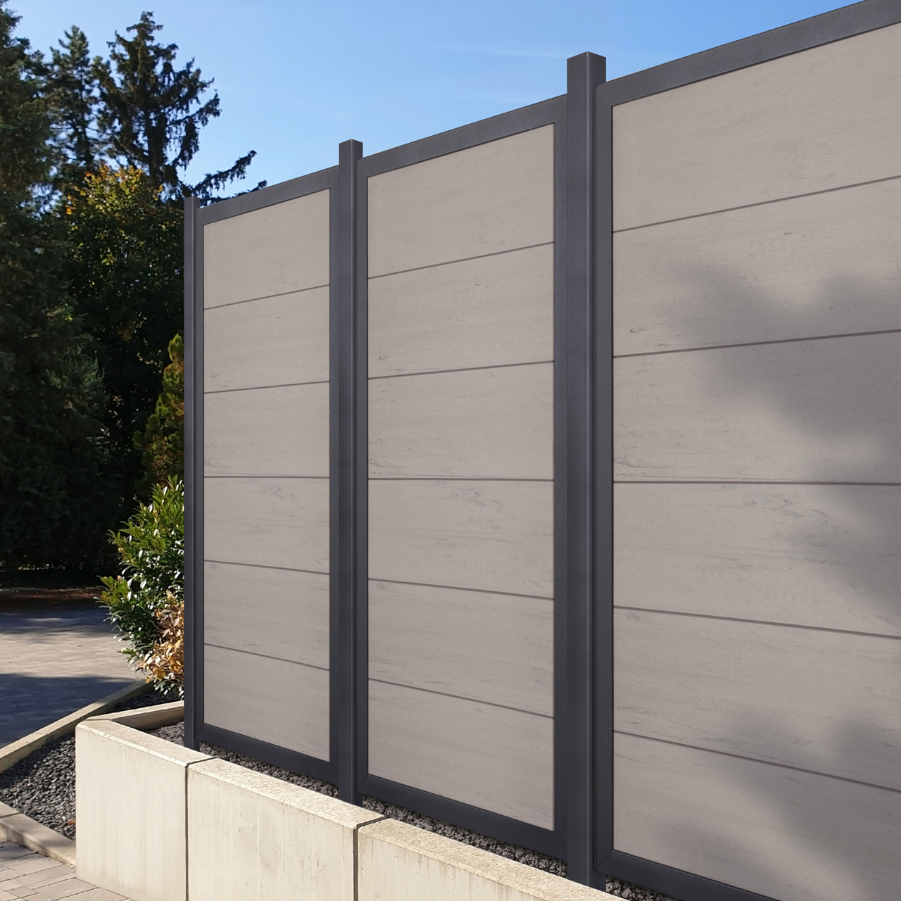 Eingefasst sind die breiten Nut- und Federprofile in einen eleganten, anthrazit-farbenen Aluminiumrahmen mit sehr feinem "Glimmer" (DB 703) der den Elementen zusätzliche Stabilität geben. Diese hochwertigen Sichtschutzwände bleiben dauerhaft ein schöner und gepflegter Sichtschutz im Garten oder an der Terrasse.