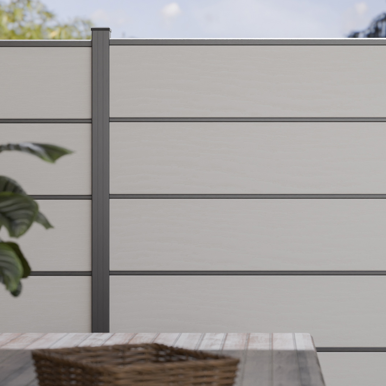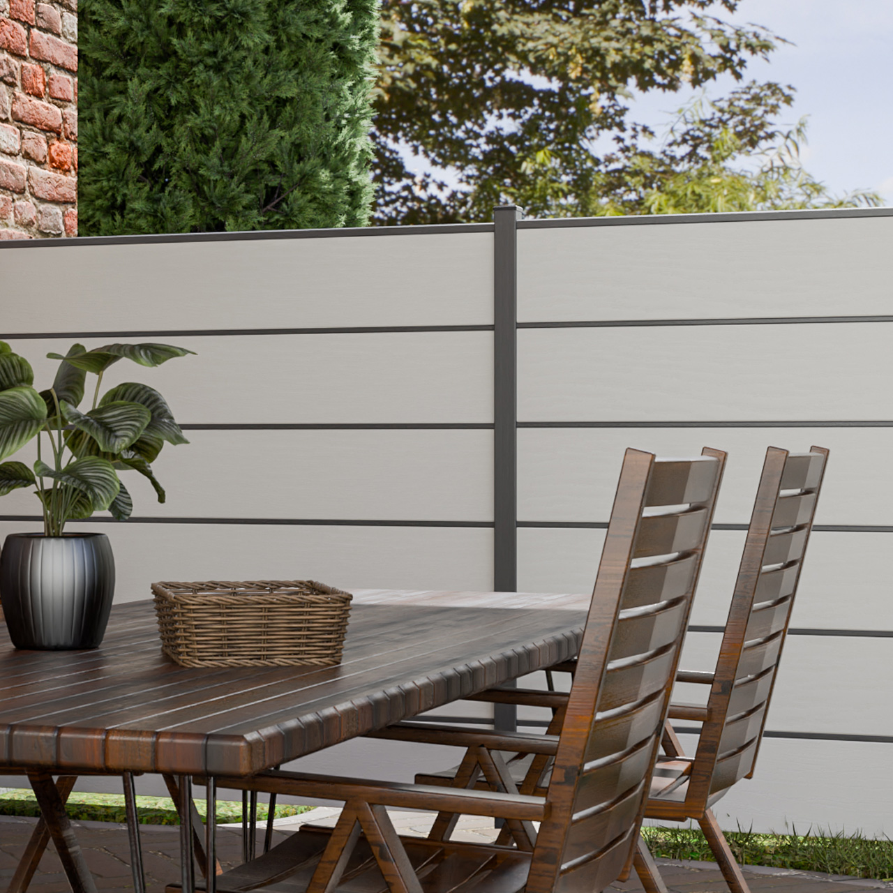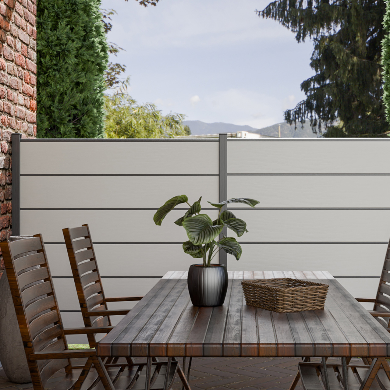 Das Steckzaun Sichtschutzelement BasicLine Premium besteht aus sechs sehr breiten Füllungen aus PVC und 5 kontrastierende Aluminium-Dekorleisten (matt aluminium-farbig), die eine sehr hochwertige Optik schaffen. Durch sie wird die Fläche des Zauns optisch gegliedert und erhält einen noch anspruchsvolleren Look. Zusammen mit der bereits breiten Auswahl an Farbtönen und Dekoren erweitert das den Spielraum für eine ganz individuelle Sichtschutzgestaltung.
